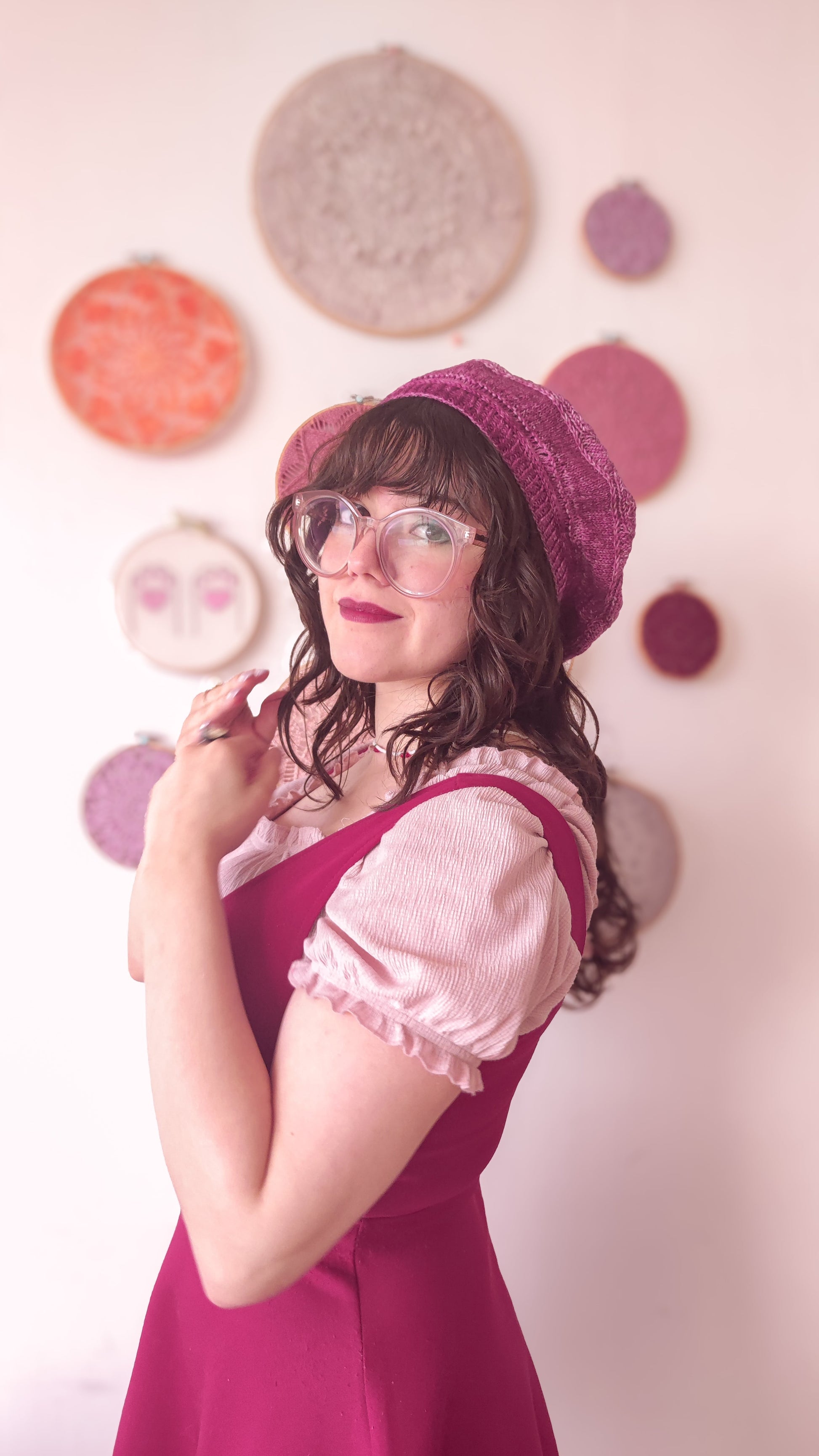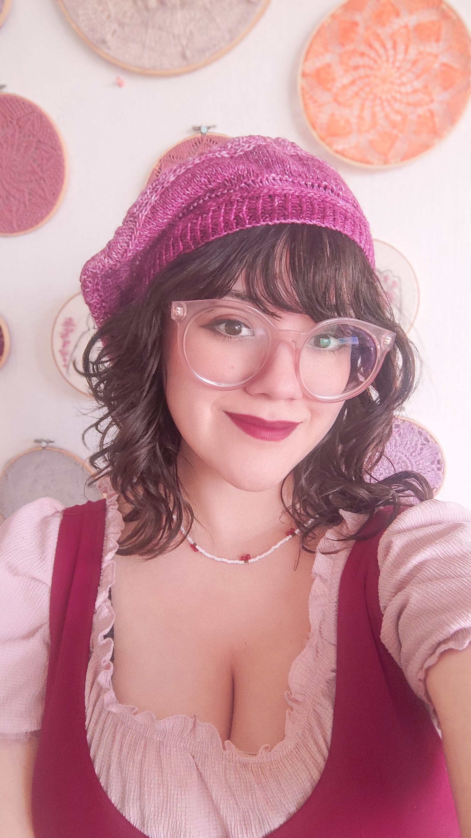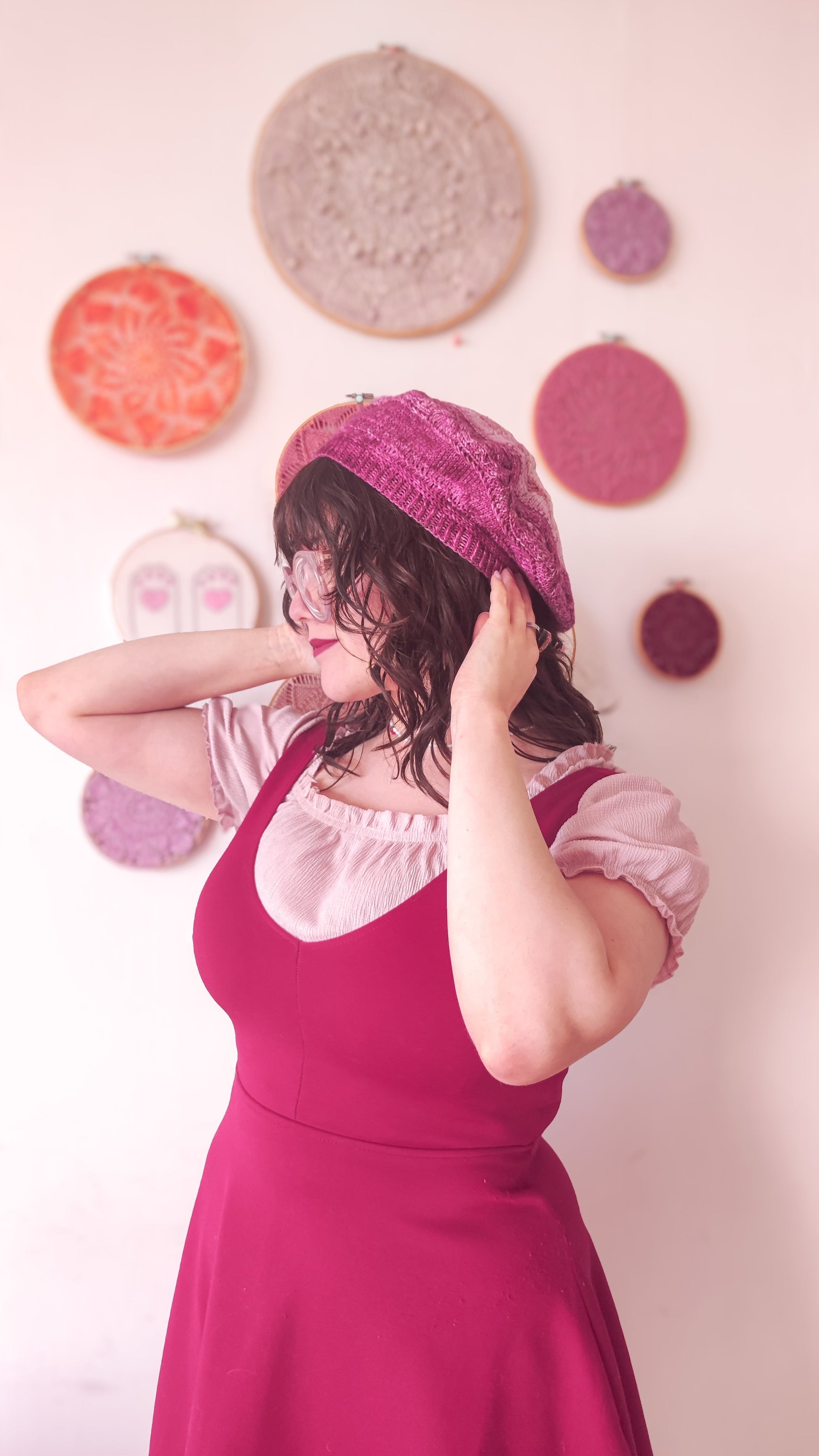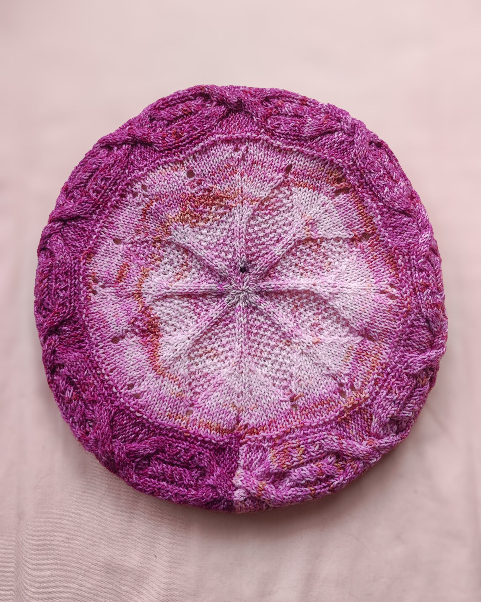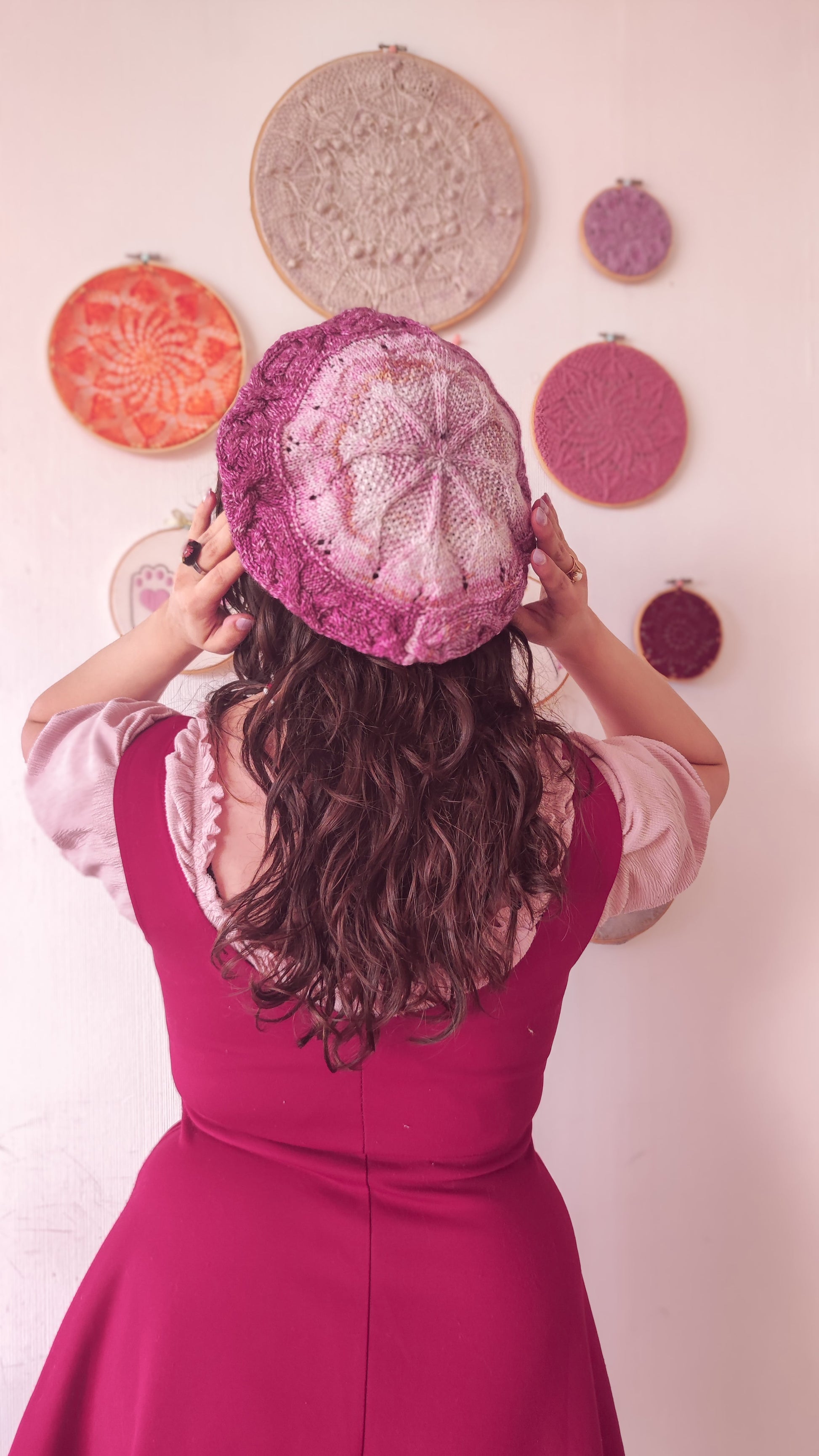 La boina se teje desde abajo hacia arriba en redondo. Luego de la pretina tejerás en punto i-cord horizontal antes de hacer aumentos. Después de tejer en punto jersey por algunos centímetros tejerás una trenza horizontal para posteriormente dividir la boina en 8 secciones, dibujando una estrella de 8 puntas al cerrar la boina.