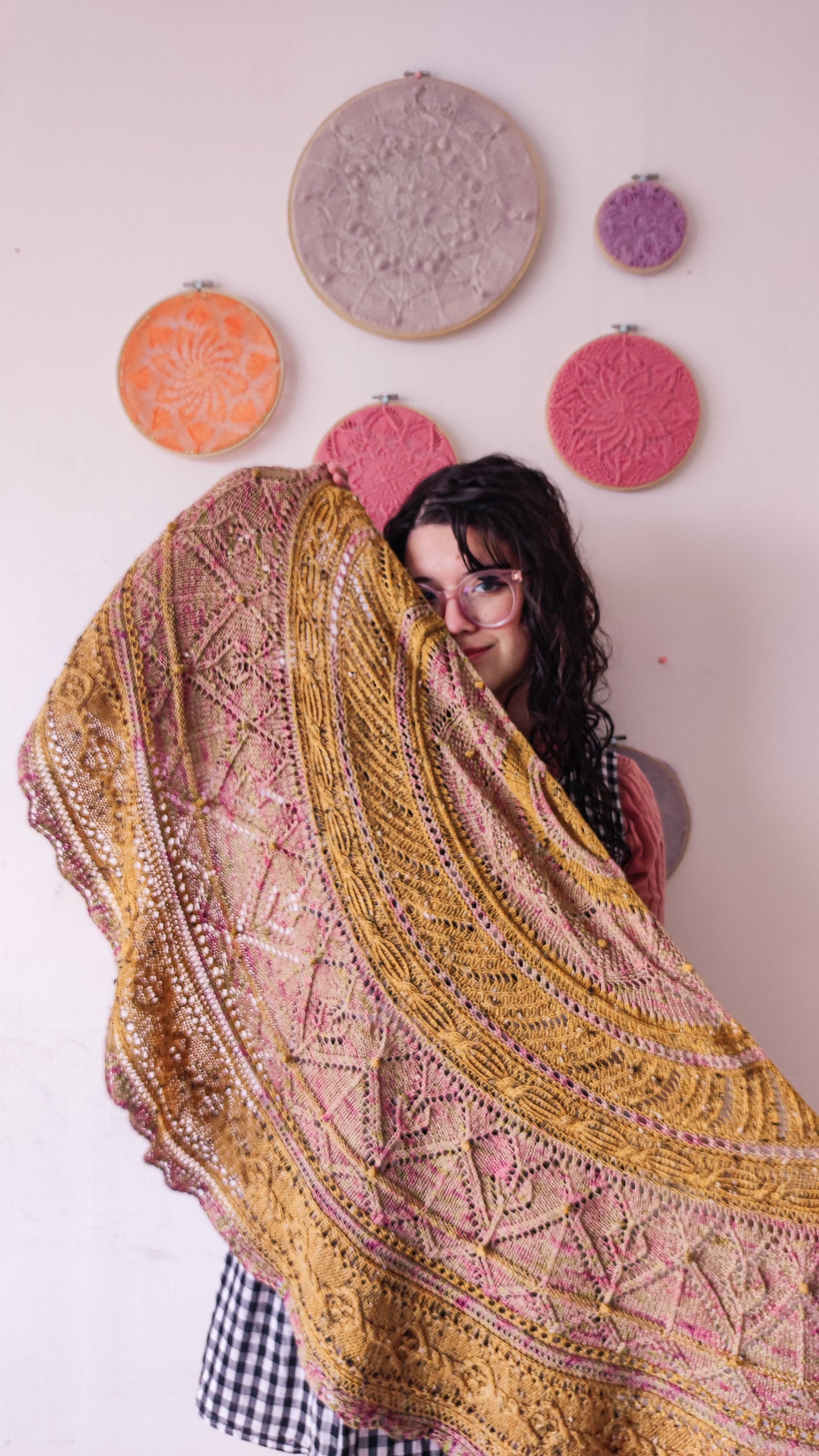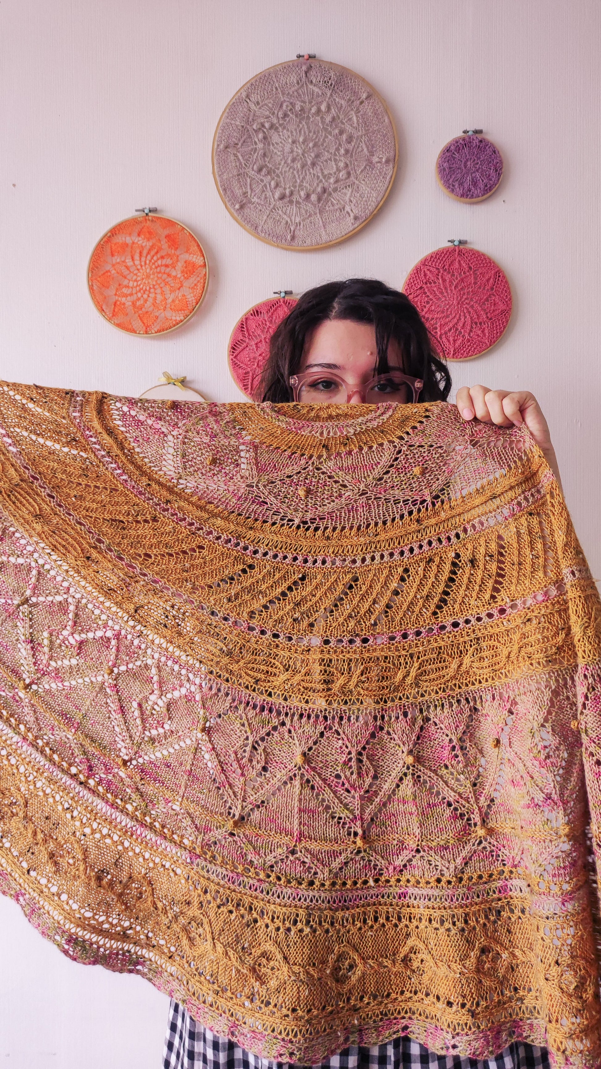 El chal se teje desde arriba hacia abajo con estructura pi semicircular. Comienza con urdido “pinhole cast on” doblado a la mitad para lograr la forma semicircular. El diseño tiene puntos calados, burbujas, i-cord horizontal y trenzas tejidas de forma horizontal. Los bordes se tejen en i-cord para dar estabilidad al chal. Se intercalan 2 colores en las diferentes secciones para dar contraste.