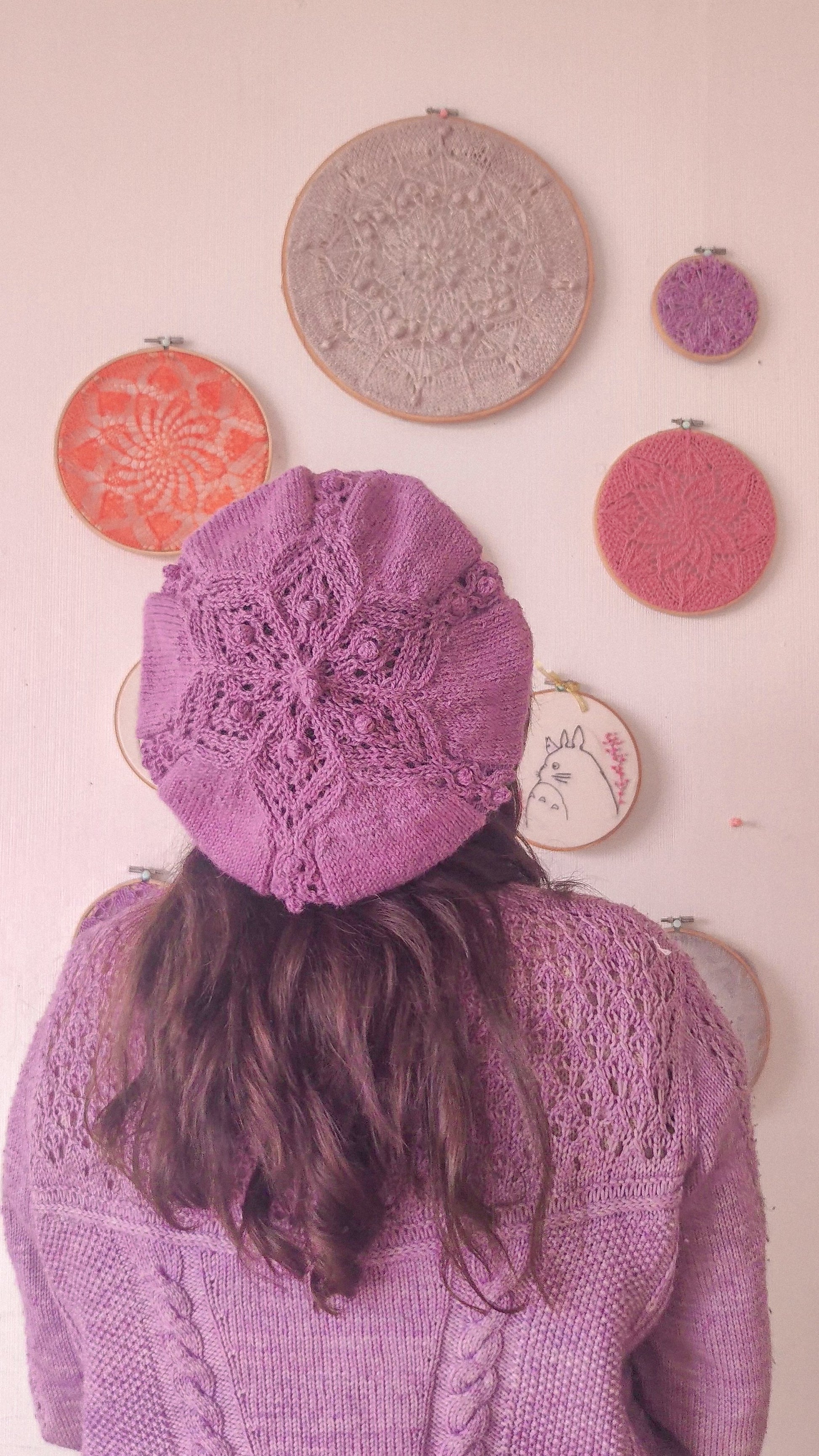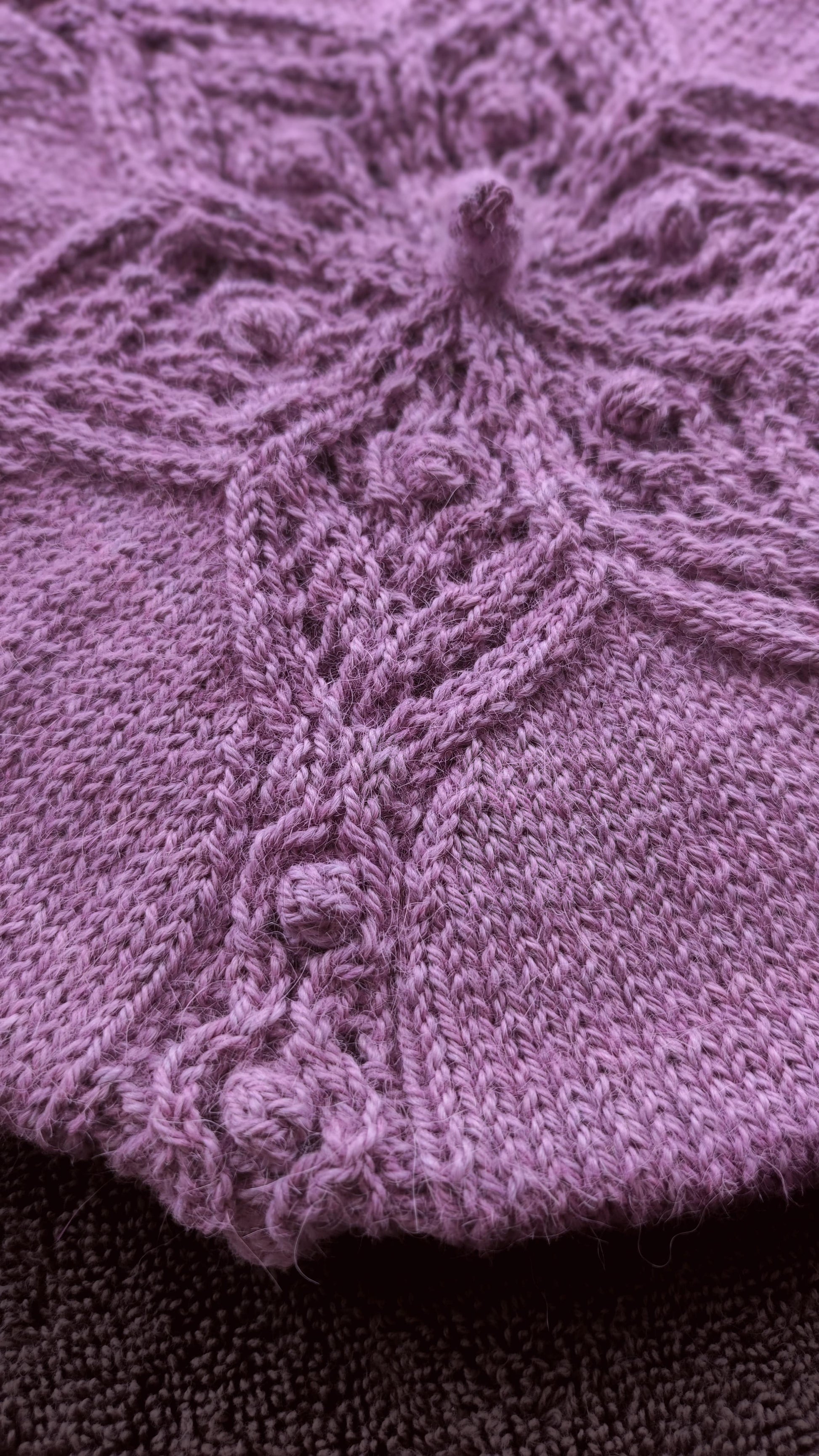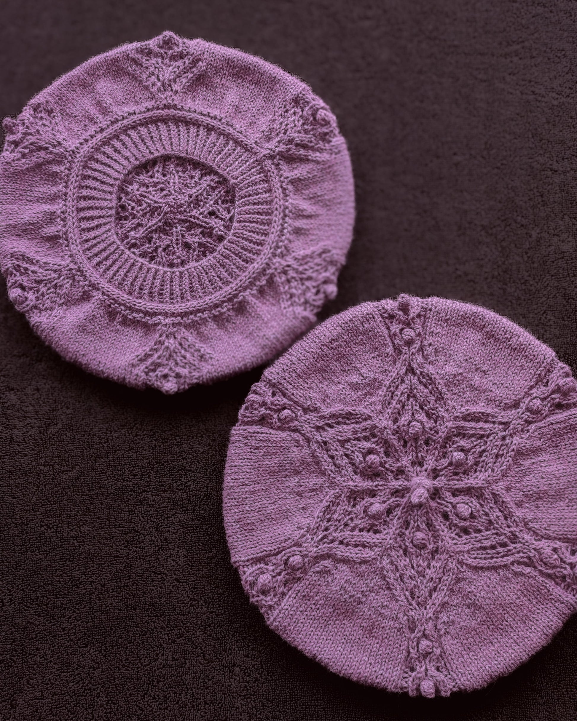 La boina se teje desde abajo hacia arriba en redondo sin costuras. Tejerás seis secciones idénticas, cada una formando uno de los seis brazos de un copo de nieve. El diseño de cada brazo se forma combinando aumentos, disminuciones y burbujas.
