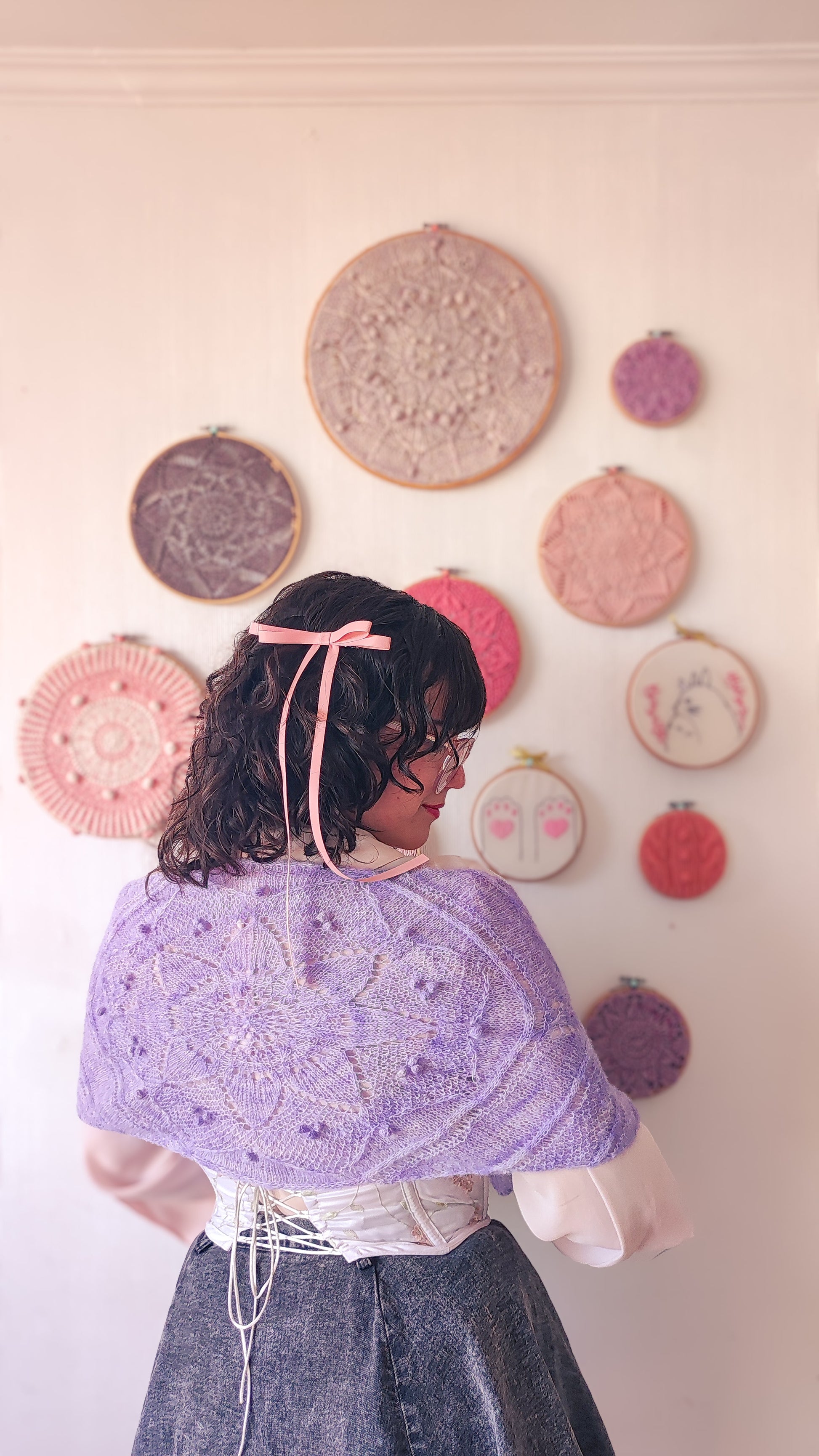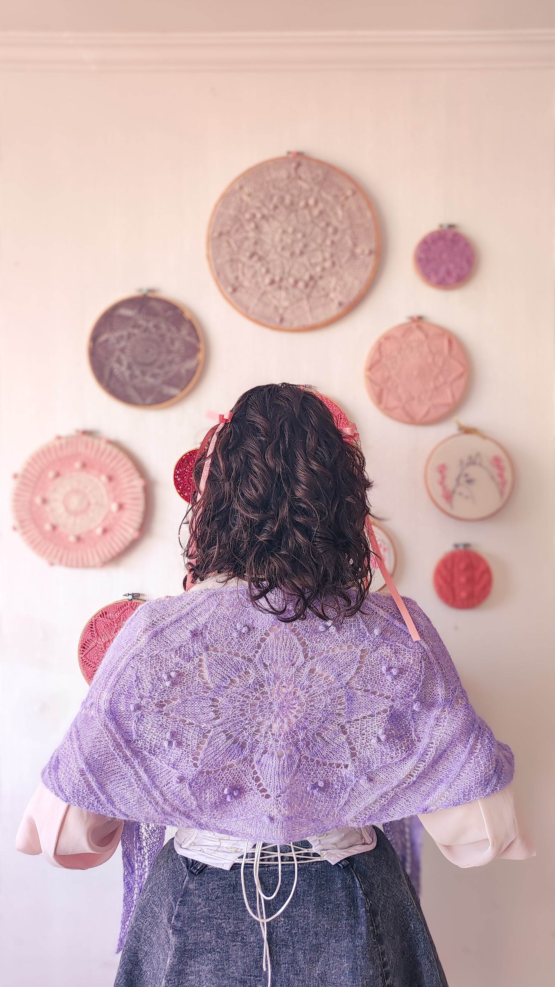 Esta pañoleta comienza a partir de la idea de incorporar un mandala en un chal. Una combinación de mis texturas favoritas para tejer en una prenda de tamaño ideal para practicar nuevas técnicas con sólo 1 madeja. El nombre Driada proviene del nombre de una flor de 8 pétalos similar al diseño formado en este mandala.