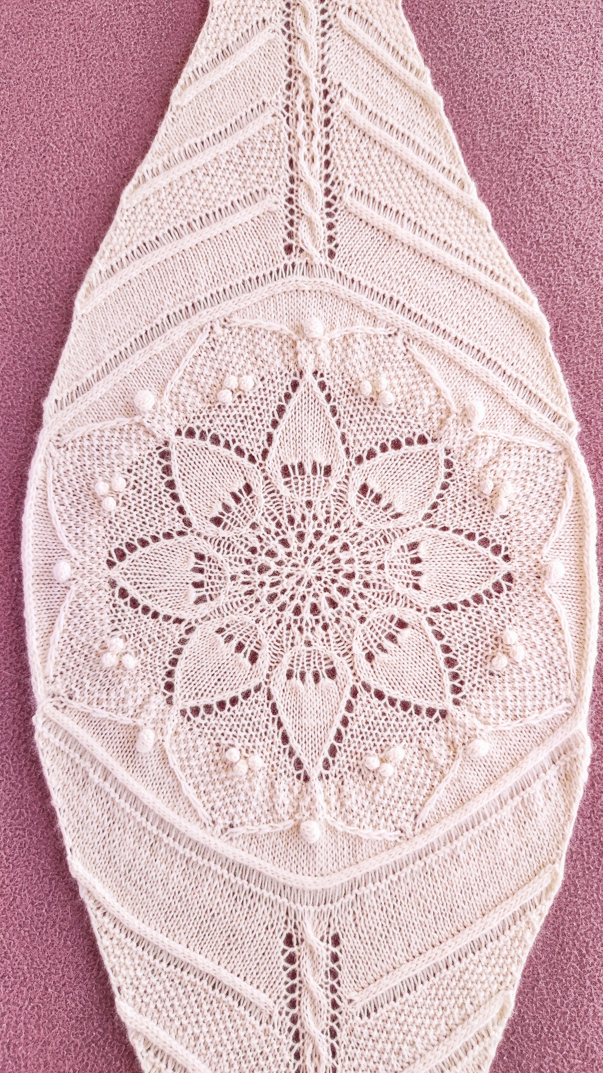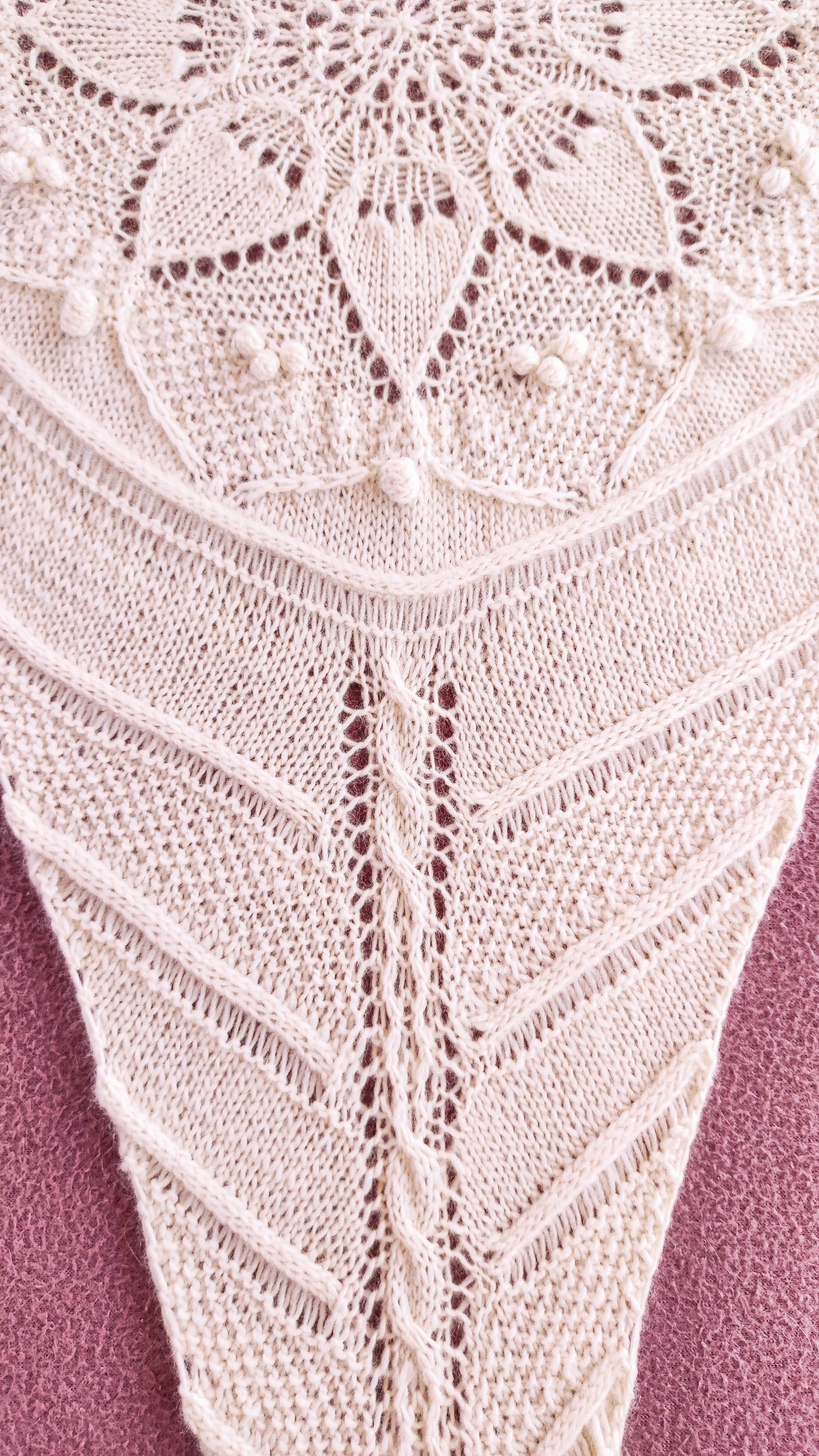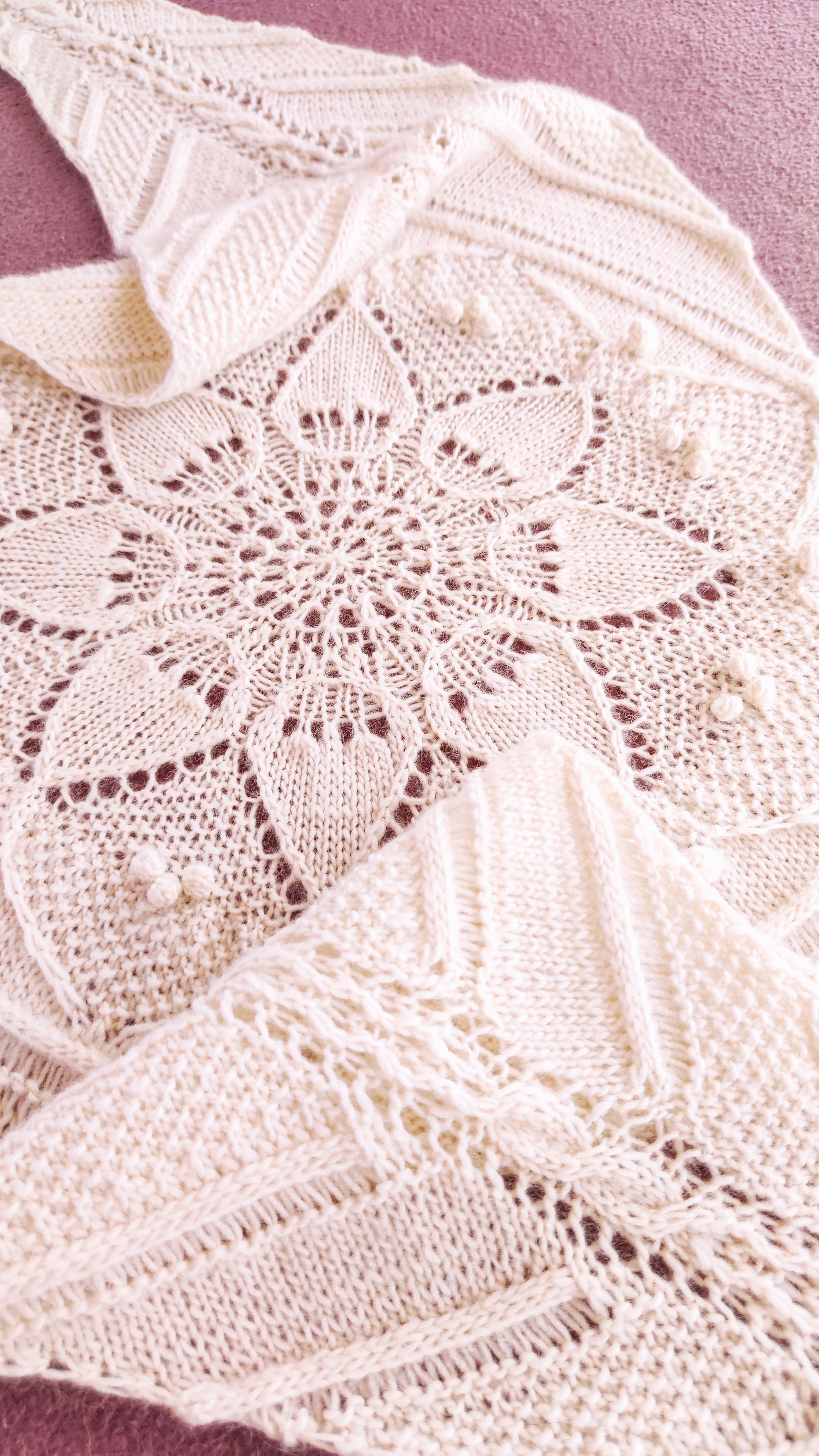 Se teje desde el centro hacia afuera comenzando con el mandala central tejido en redondo. Utilizando la fórmula Pi Shawl se realizan aumentos para lograr el tamaño del mandala y el diseño se forma combinando lazadas, disminuciones, trenzas y burbujas. Se cierra el mandala con cierre I-cord y I-cord horizontal para separar los laterales que serán tejidos de forma plana. Ambos laterales se tejen de la misma forma realizando aumentos y disminuciones para lograr la punta de flecha en cada lado. El diseño de los laterales se forma por secciones de punto jersey y punto arroz, separadas entre sí por I-cord horizontal y una trenza en la parte central de cada lateral.
